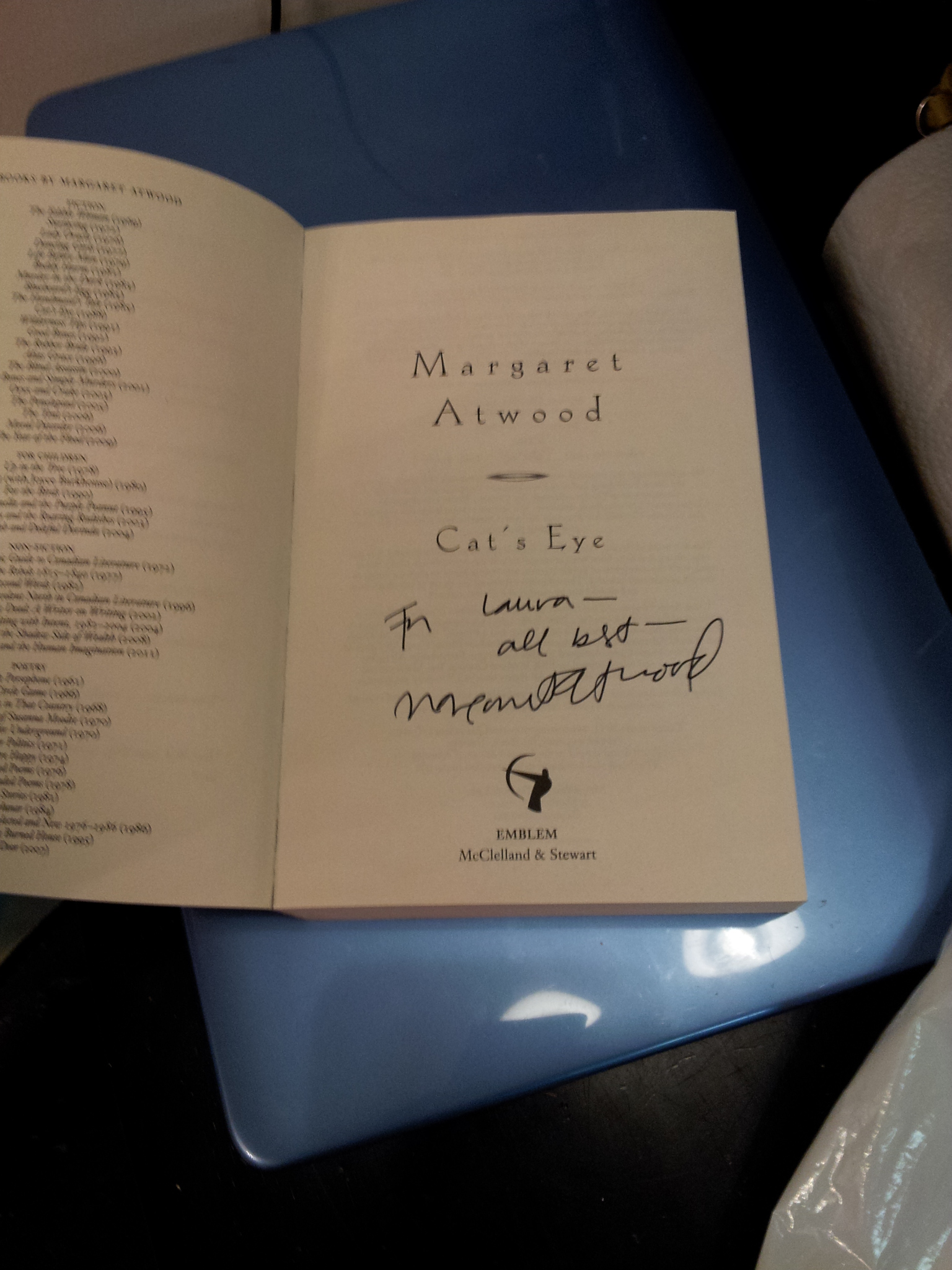 This sounds like it was pretty awesome. A friend of mine just got me Atwood’s autograph a couple months ago, and I chose to have her sign Cat’s Eye, too (it’s one of my favorites). Autograph twins! Hahaha!