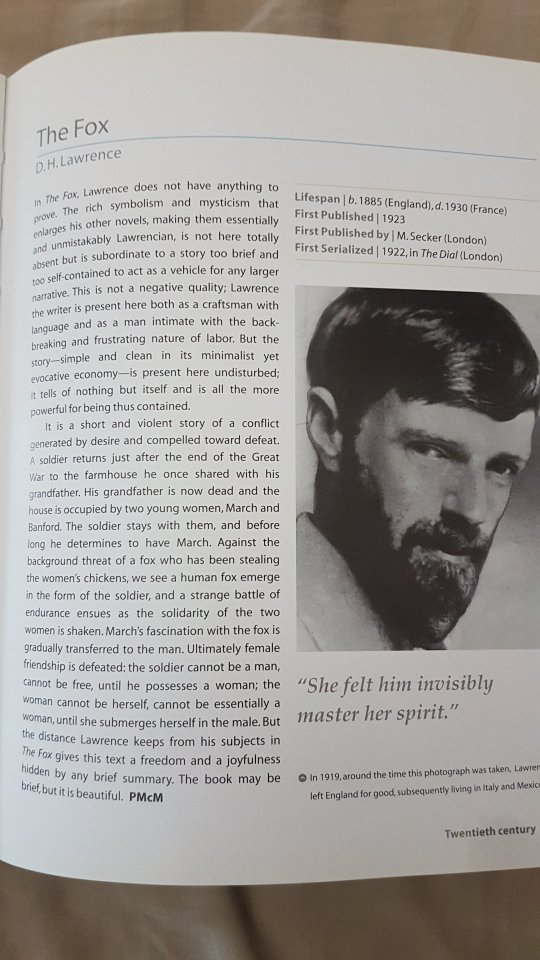 The Fox is a borderline novella, 86 pages in my wide-margined and illustrated edition. The 1,001 Books write-up begins by contrasting the length of this book with Lawrence’s major works, calling it “too brief and too self-contained” to include much more than plot. I can’t argue that it’s brief, though I would argue that there’s plenty of the “symbolism and mysticism” the reviewer found lacking, right where you’d expect it – the titular fox, who poaches chickens from two women running a small farm, is transposed onto the returning WWI solider who disrupts their solitary life: