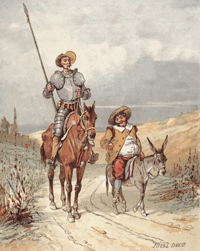 Speaking of “The Gang”, Don Quixote has a gang too – but only when he’s at home. In La Mancha, he hangs out with a priest, a barber, a “bachelor” (i.e. a student or scholarly young man, i.e. a nerd – every sitcom needs one!), a housekeeper and a niece. When he’s adventuring, though, it’s all about his squire, Sancho Panza.