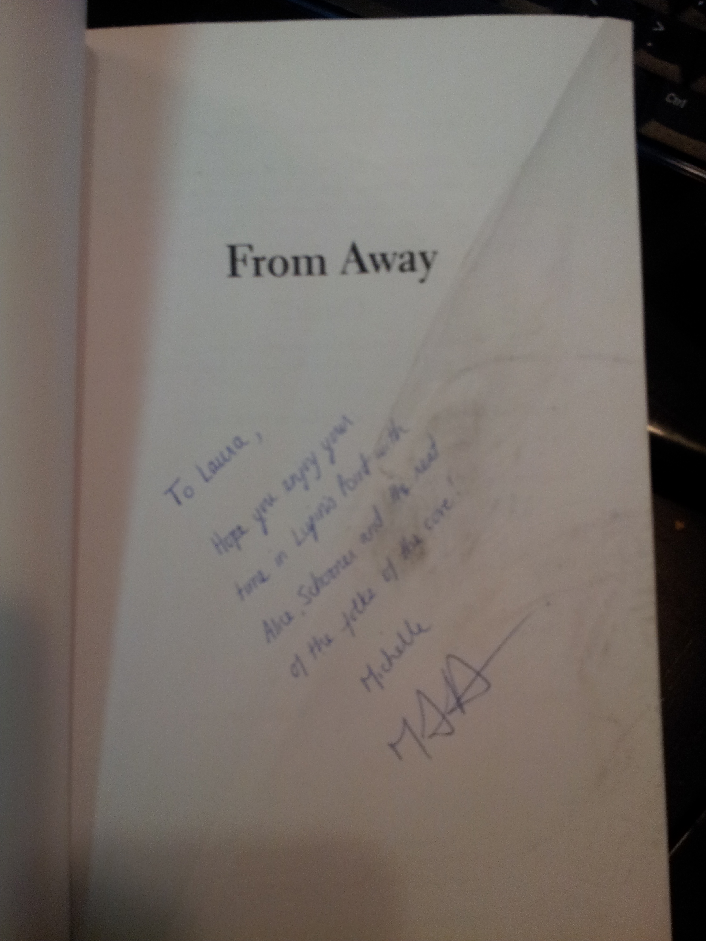 - In other Bad Book Owner news, my mom finally returned my signed copy of From Away. Yes, that is a FOOTPRINT over the author’s note and signature. This is why I can’t have nice things.