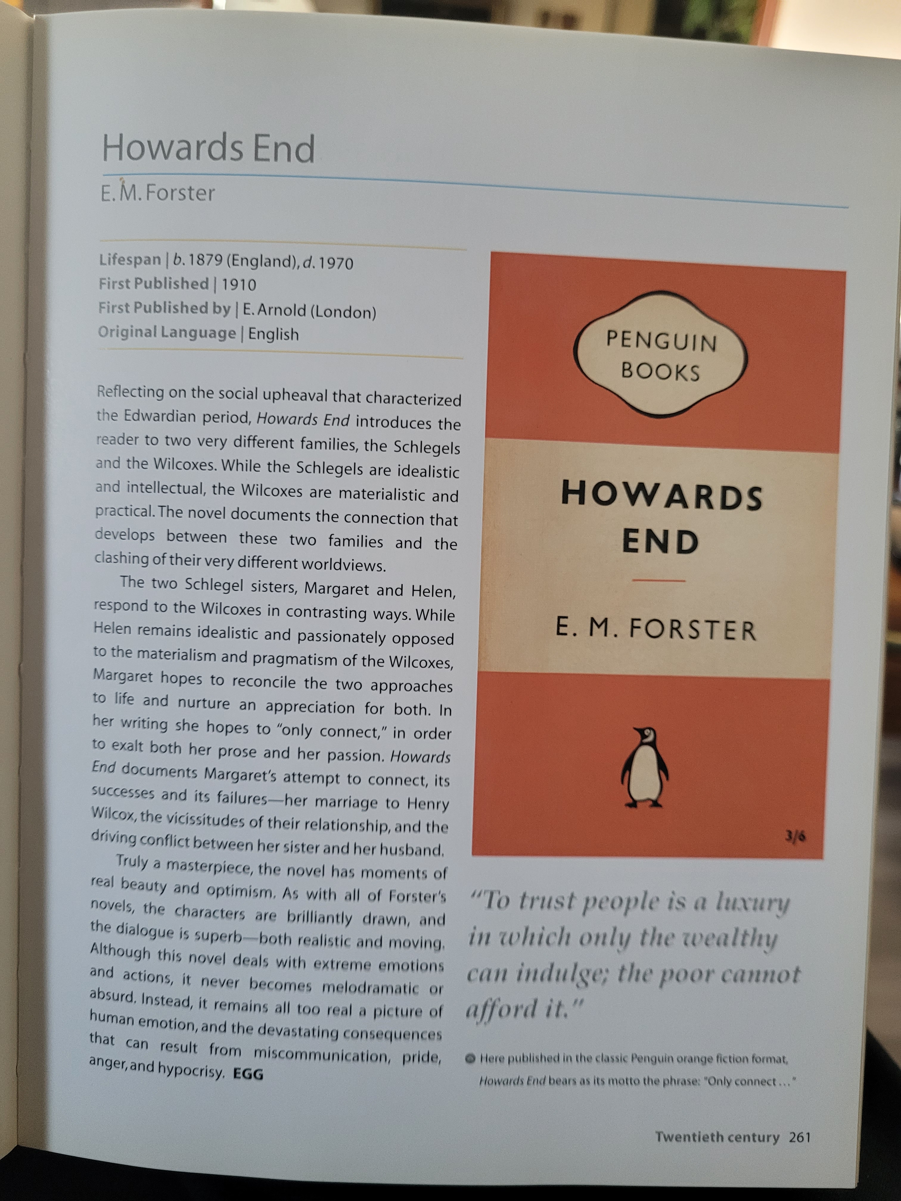 The 1001 Books write up is on the bland side, so I started flipping through the adjacent pages, to see what else was happening circa 1910. Plenty of fellow modernists like Woolf, Lawrence, and Mann, but also the more traditional John Galsworthy. The write up for The Forsyte Saga (1906) could have applied to Howards End in that it mentions Beauty (with a capital B) and the urge to possess it, and how the family unit can stand in for society. It also calls it a “monument to the Edwardians.”