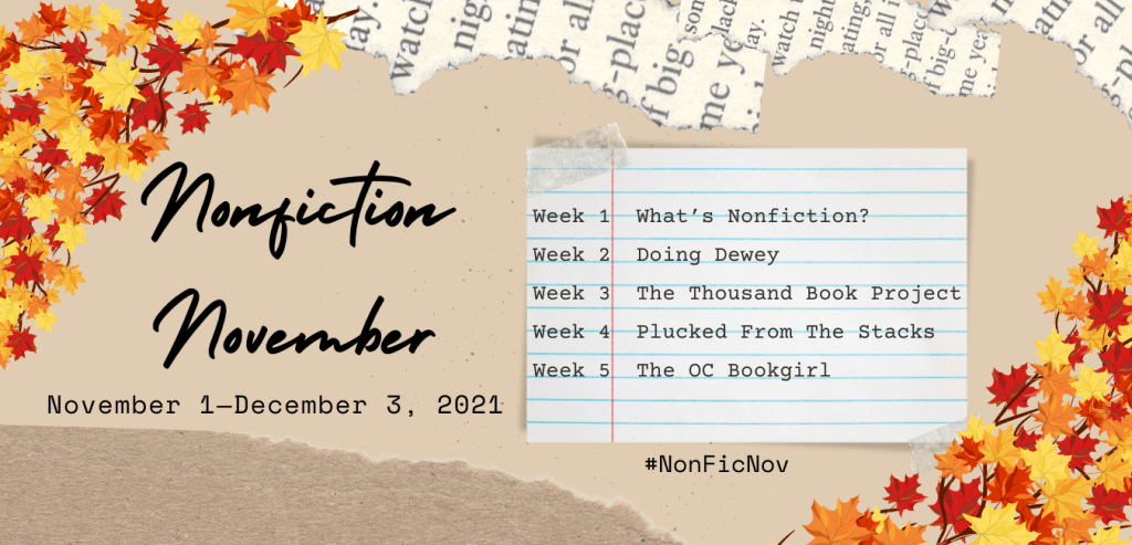 Nonfiction November has been running for many years. Returning hosts Doing Dewey and What’s Nonfiction are joined by newcomers The Thousand Book Project (sounds like we’d get along), Plucked From the Stacks, and The OC Book Girl.