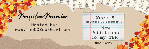 The final #NonFicNov prompt is hosted by Jaymi at The OC Book Girl. Despite some early efforts, I did not keep up with her daily Instagram challenge. For me, Instagram isn’t a place to post, it’s a place to see what my Millennial and Gen Z cousins are up to, and to indulge in hyper-local memes and cringe TikToks. Anyways, Jaymi encouraged us to keep track of the nonfiction books added to our TBRs in preparation for this week, which I did, until the 15th. So this will lean heavily on the first two weeks of the event. My new additions: